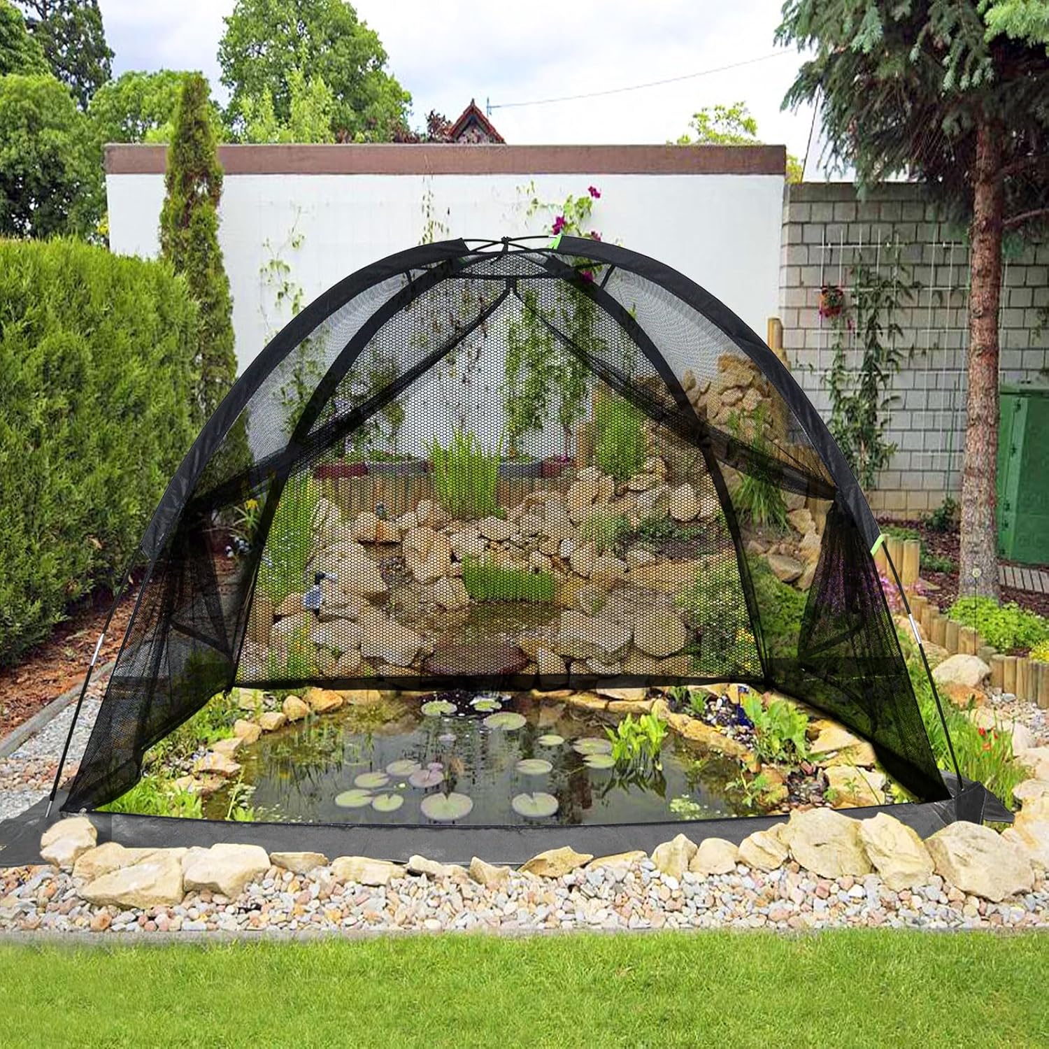 - Protective pond net cover dome - Pond garden net protects koi from jumping out especially when the weather is hot; the koi pond net cover is also a must-have accessory for vegetable gardens, protecting the fruits and vegetables from leaves, birds, raccoons, squirrels, and other critters like bunnies, deer, and herons. The lightweightpond cover net can be placed directly on crops, plants and ponds, giving your plants an easy and quick protection.