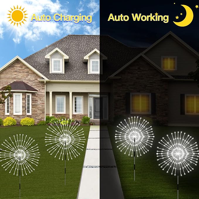 - 🎁Why Choose Us: We provide a longer warranty service--24 months, if you encounter problems during use, please contact us, we reply within 24 hours and is a satisfactory reply. At the same time, our products are very suitable as gifts, you can give this solar fireworks lights outdoor to your family or friends on Mother's Day, Father's Day, Thanksgiving, Halloween, Christmas and other festivals, I believe they will like it