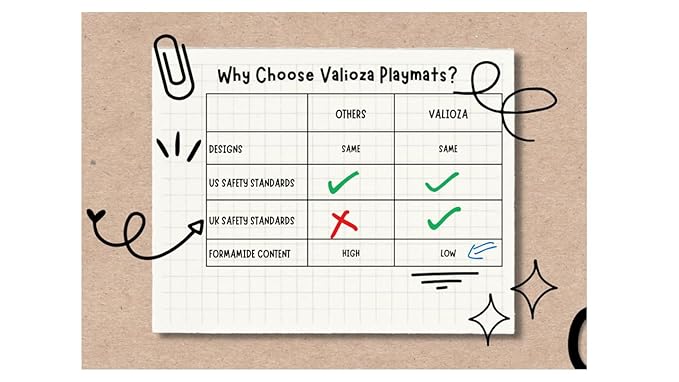 - Safety First: Valioza Play Mats are exceptional quality playmats, safe for the baby and safe for the environment. They are non-toxic, free of heavy metals, phthalate, formaldehyde & BPA. You can relax! We have taken care of the bad stuff 😊