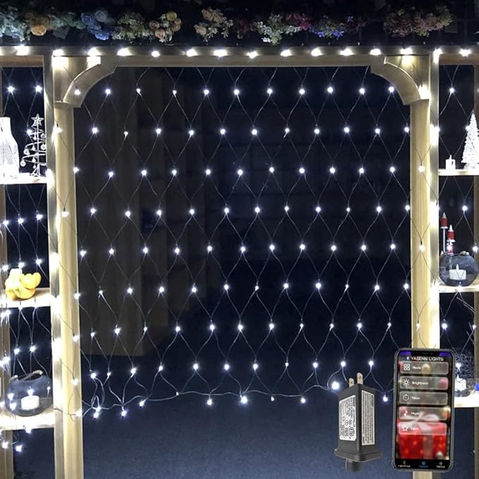 YASENN Bluetooth APP Controlled Net Lights 300 LED Mesh Light 12x5ft Fairy String Lights for Garden Patio Fence Bushes Shrub pergola Christmas Decorations(Cool White)