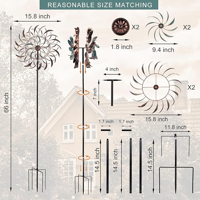 - Large Wind Spinners: Metal wind spinner adds a touch of vitality to your outdoor decor. It spins with the breeze, shining in the sunlight. Perfect for pathway, patio, lawn and garden decor