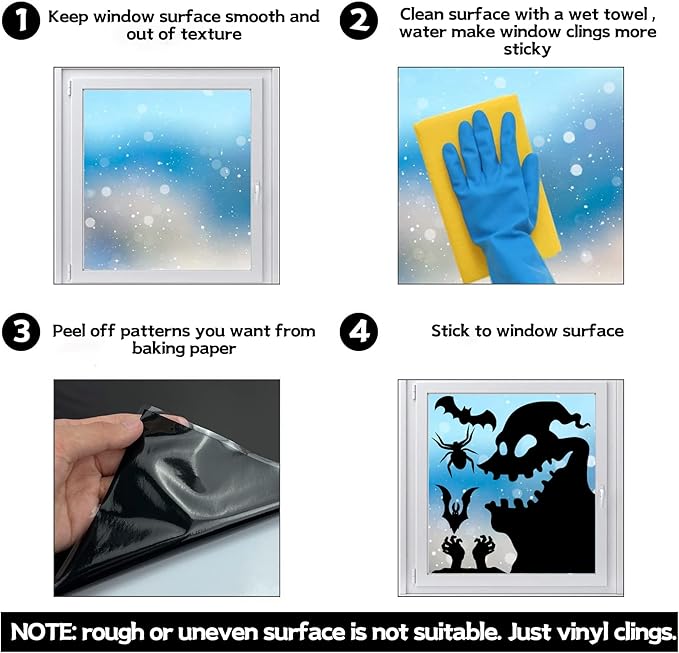 - EASY TO USE: First, wipe the window with wet towel to make it clean and wet. Second, peel the window clings from the sheets and apply the window clings to your windows, Third, remove the bubbles carefully, These window silhouette are easy to put on and take off, no adhesive and glue, These spooky window ckings can be reused