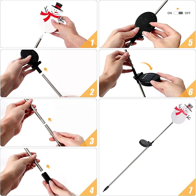 - ASSEMBLE EASILY: Complete with detailed instructions. These solar Xmas pathway makers can be done in a few minutes. Just connect the stainless steel parts and stake into the soft ground where there has direct sunlight. In stormy weather, please keep the solar lights indoor to avoid damaging the solar panels