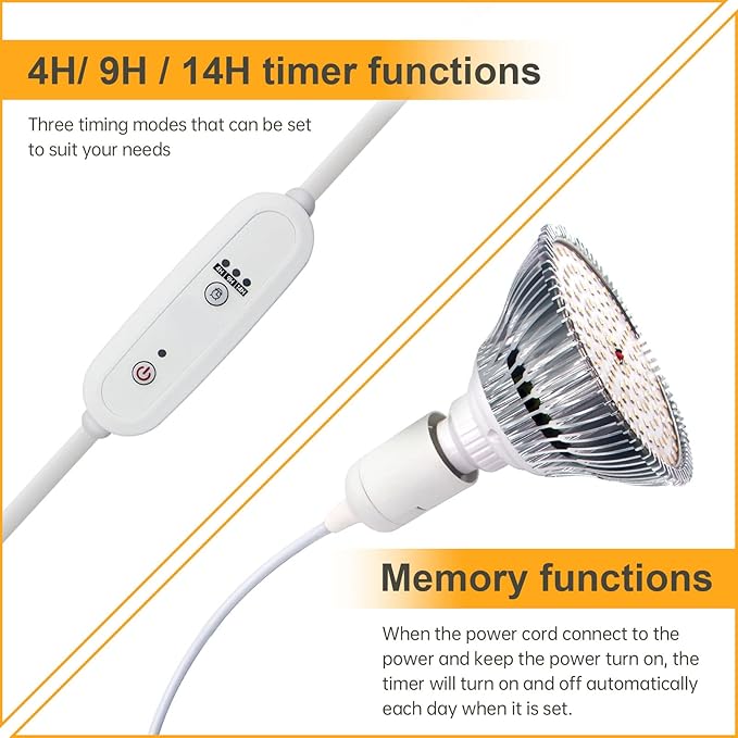 - Cycle Memory Timing Function: Our plant grow light is equipped with a cycle memory timer which allows the users to set the light to operate for 4,9, or 14 hours at a time without having to worry about manually turning it off. It will automatically turn off after working according to the time you set, and will automatically turn on when the next cycle starts