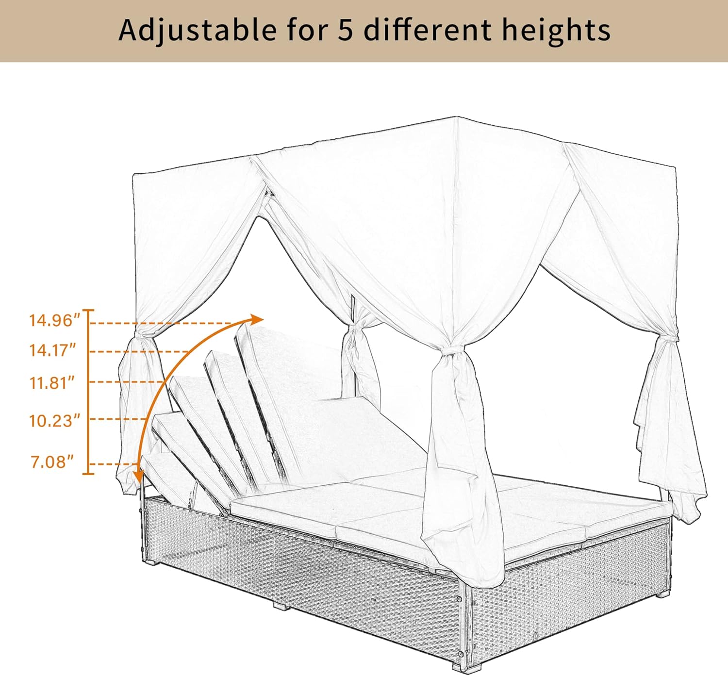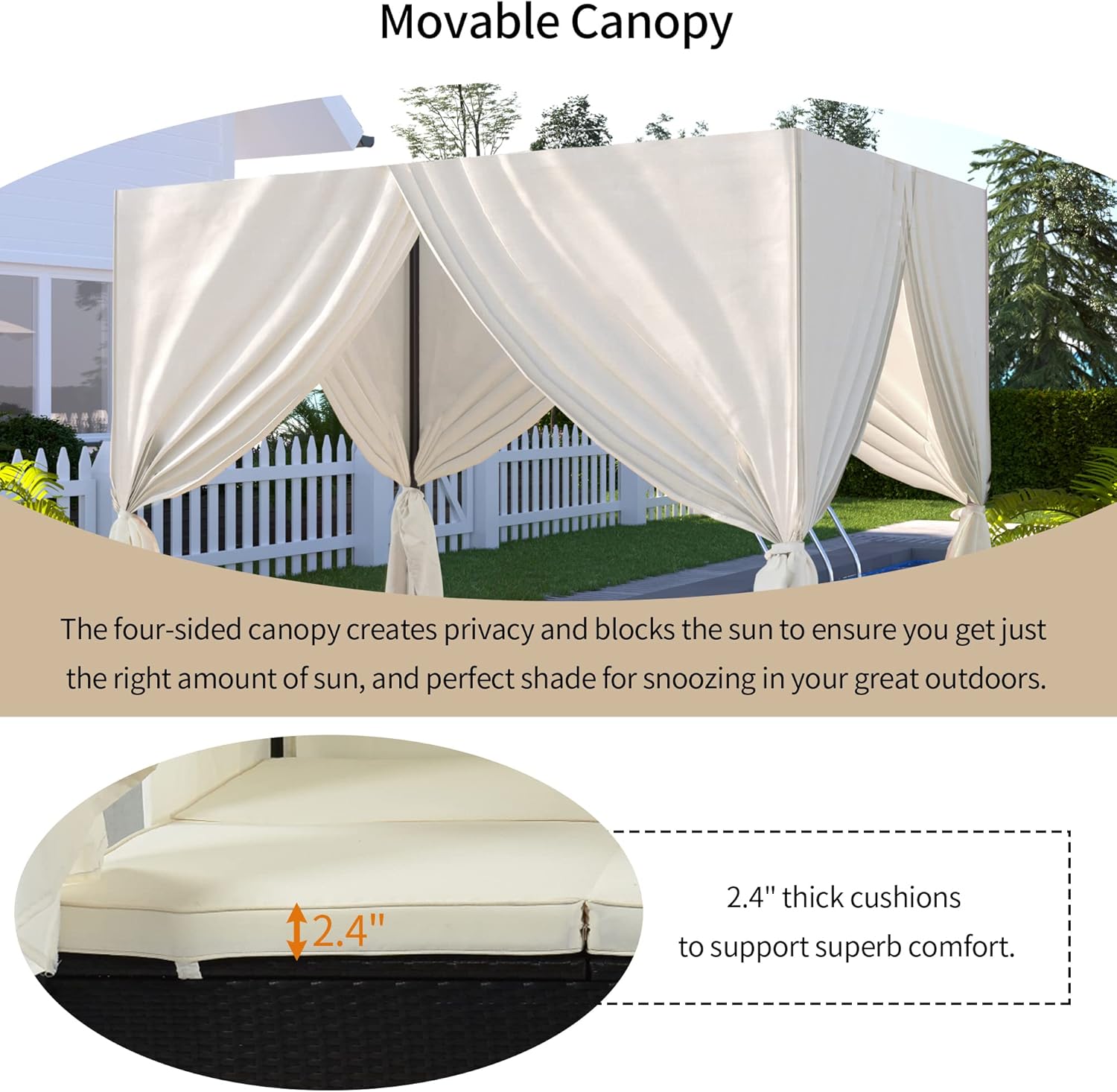 Patio Chaise Lounge, PE Rattan Outdoor Patio Wicker Sunbed Daybed with Adjustable Seats, Four-Sided Canopy, Overhead Curtain and Beige Cushions for Backyard, Garden, Poolside (for 2-6 People)