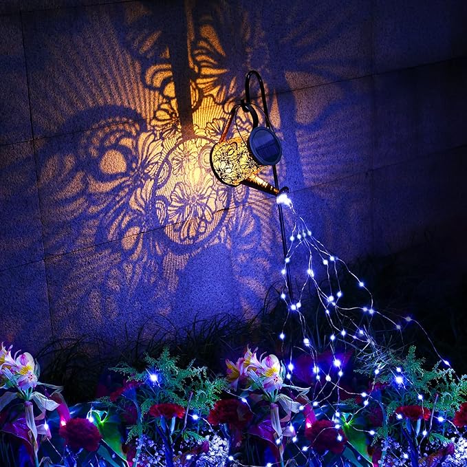 - Solar Watering Can With Lights -- VOOKRY Solar Garden Lights(with Shepherd Hook) comes with 5 LED String Lights (50 LEDs), The light wire is 3.28 feet long, which can be easily bent and shaped into any shape you like, perfect for DIY. Turn on the light at night and it will present a vivid and beautiful retro hollow pattern. Decorate your watering plants, vines, potted plants, porches, paths, patios and more, the perfect addition to your garden decor
