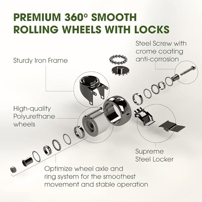 - PREMIUM 360 DEGREES SMOOTH ROLLING WHEELS WITH LOCKS: 360 degrees rotation Polyurethane wheels are resilient, flexible, and durable. Smoothly rolls on any surface such as carpet, soil ground, and lawn without being stuck or locked up. Locking wheels allow you to lock the caddy in place and prevent sliding.