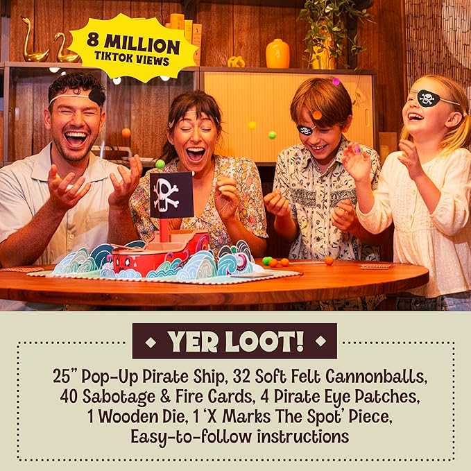 - The Perfect Gift For Any Game Collection - Perfect for birthdays, holidays, pirate parties, or anyone who loves silly games. Comes with everything you need: a folding pirate ship, sabotage cards, felt cannonballs, wooden die, and real pirate eye patches.