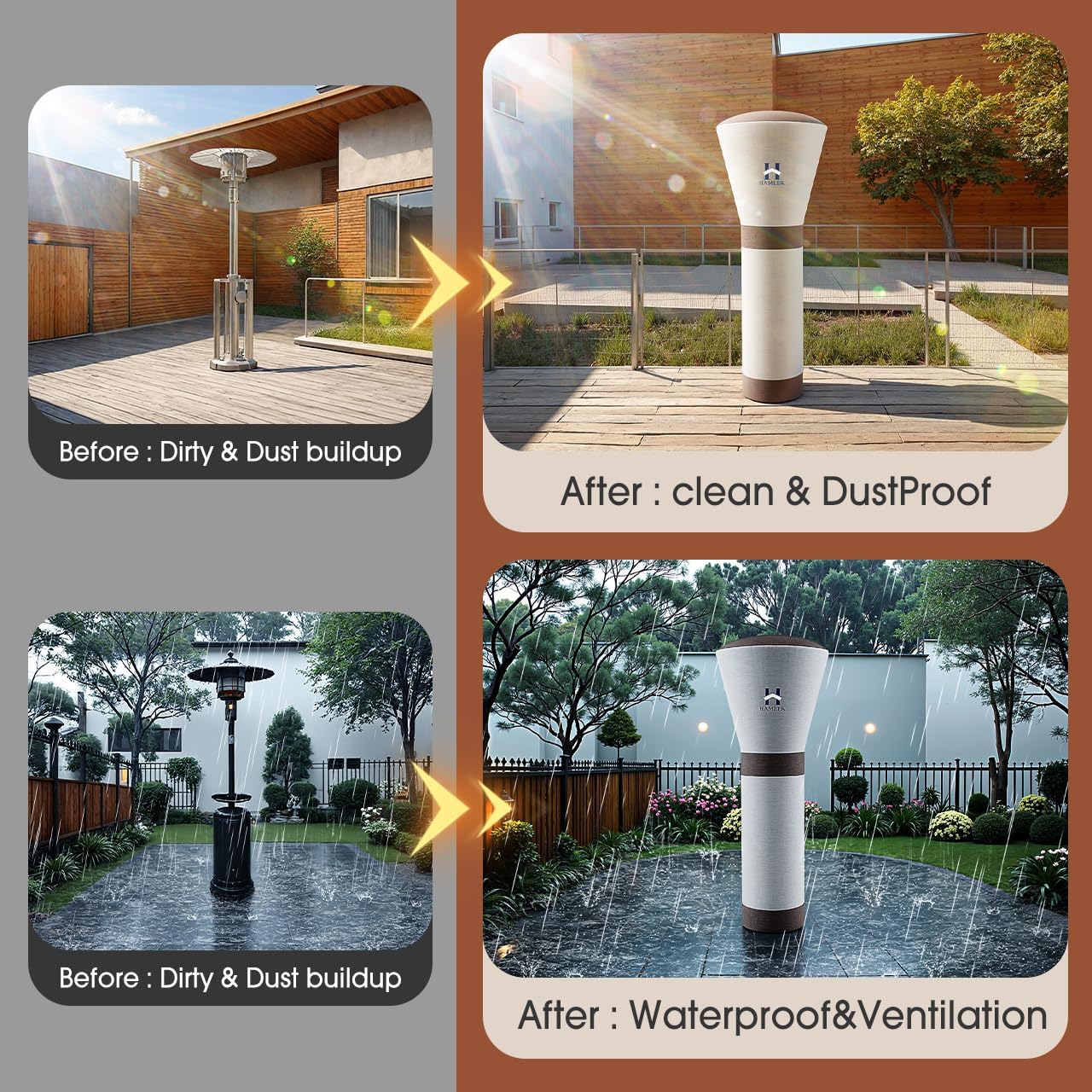 - EASY TO USE: The zipper on the back of the heater covers is designed for easy installation and removal.The woven design ensures that rain and snow will not leak into the inside of the garden heater cover.