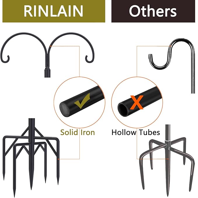 - 【5-Prong Base With Solid Iron Bar】Our shepherds hook was designed to 5 Prongs base which is more stability and firmness than normal 2 or 3 prongs shepherds hook. Extended 5-prong base enable the pole stand firm in the soil. And it is made of solid iron bars instead of hollow iron tubes. It will be stronger and more long lasting than other conventional shepherds hook.