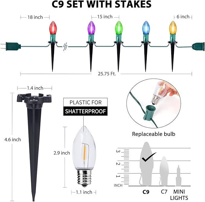 - Shatterproof & Waterproof: The bulbs of C9 christmas string lights made of plastic, much shatterproof than traditional glass bulb. IP44 waterproof durable C9 string lights can withstand extreme temperatures, rainy, windy, or damp climates. Each LED bulb stays cool to touch even after hours of illumination