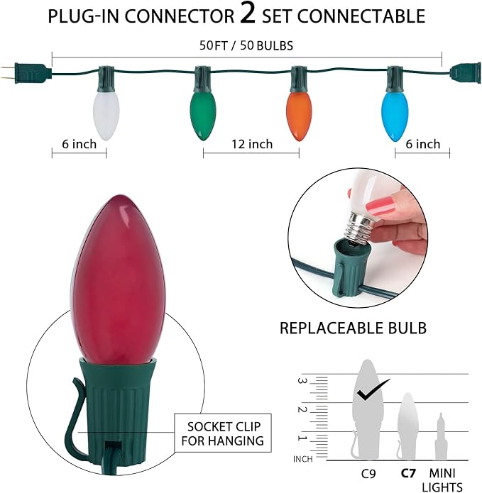 Multicolor C9 Christmas Lights Ceramic, C9 50ft Vintage Incandescent String Lights with Opaque Bulbs for Christmas Tree Patio Roofline Outdoor Indoor Holiday Xmas Decorations, 50 Bulbs with 2 Spare