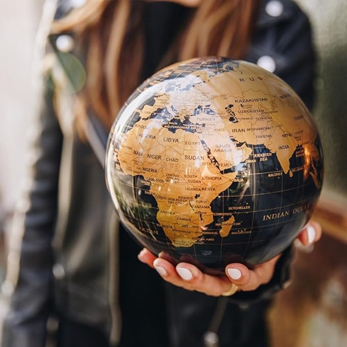 - Metallic Gold landmasses against jet black oceans commingle on this refined world globe