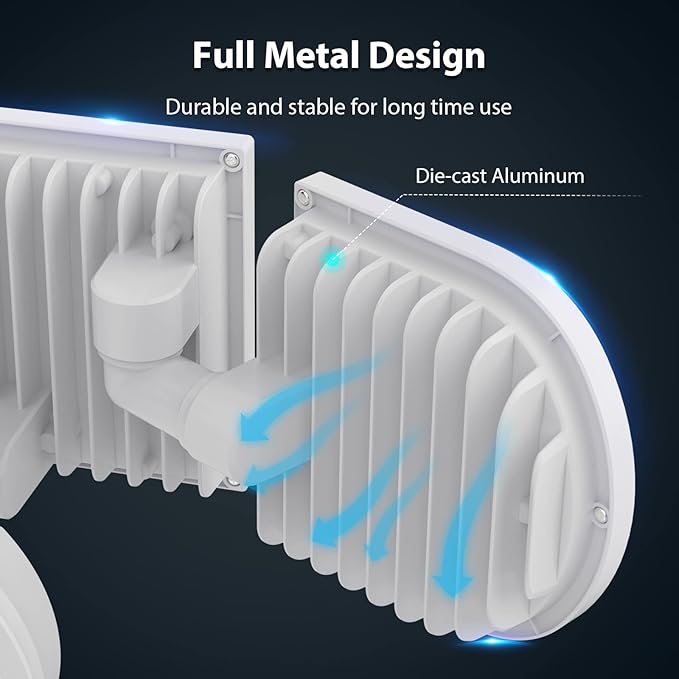 - Long Time Use: Made of resilient die-cast aluminum and designed with a fin-shaped back cover, the LED Security Lights Motion Sensor efficiently dissipates the heat and have a greatly prolonged lifespan. Much more stable and reliable than those made of plastic.
