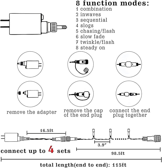 - Charming Xmas Lights: Christmas 300 LED string lights, use UL-certified 29V low-voltage plugs to ensure the safe use of the product. The outdoor Christmas lights has 16.5 FT leading wire, and the light string is 98.5 FT, total length is 115 FT, the bulb spacing is 3.9 inch. The string light using green wire, which looks more natural and suitable for winter using.