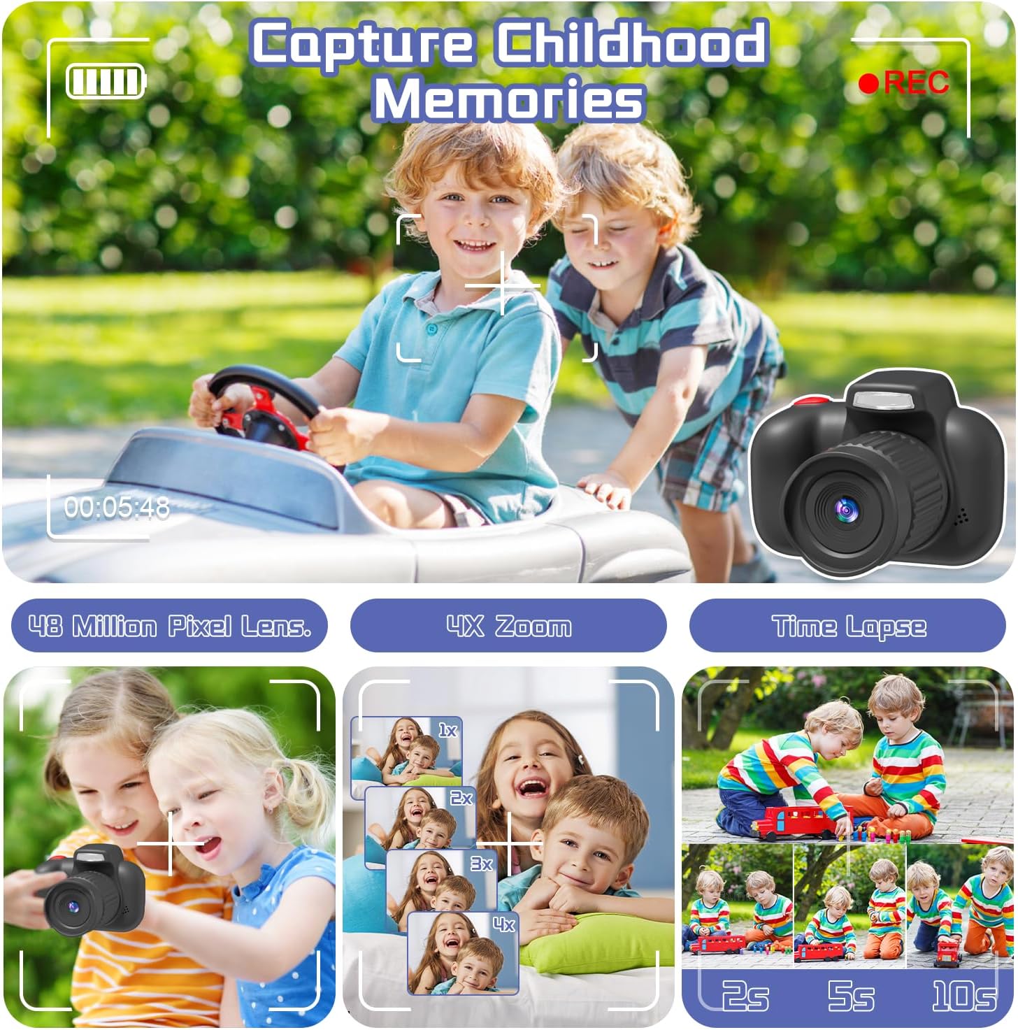 - 🌞🌞【HD Kids Digital Camera】Children Camera is Equipped With A High-quality Auto Focus And 48m Megapixels Lens, Supports 720p, HD 1080P Video Recording, Greatly Improves The Quality Of Photos And Videos, Also Can Help Kids Capture Life's Beautiful Scenes, Some Hilarious Photos, And Wonderful Moments With Friends And Family.