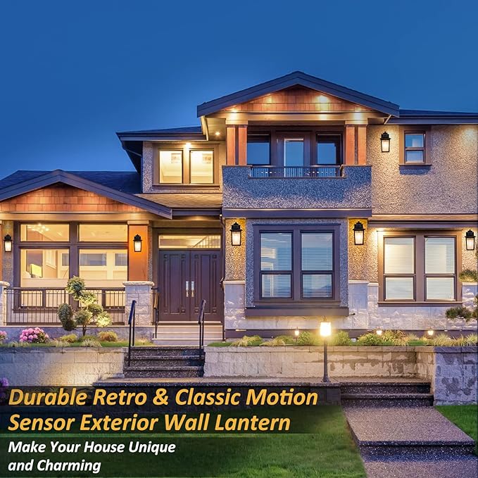 - 【Classic, Modern & Widely Application】The frame of the motion sensor wall light is designed with a simple and modern structure and a textured matte black finish. It is also matched with a unique and delicate glass to emit a charming glow. The outdoor wall light is so eye-catching whether as an outdoor decor of your house during the day or as an enchanting fixture at night. You won't find any light with such a stylized and flawless look, ideal for a place in doorway, garage, porch, yard etc.