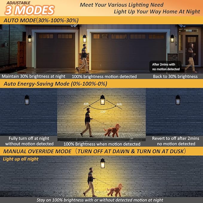 - 【Updated PIR Motion Activated & Dusk to Dawn IC Sensor】Our high sensitivity motion sensor outdoor light can provide smart lighting with 3 modes. Mode①: The exterior light fixture could fully off with no motion detected and turn to 100% brightness once motion is detected at night. Mode②: The porch light keep 30% light with no motion activated at dusk, activated with 100% brightness, and back to 30% brightness after 120s. ③Manual override mode which can stay 100% brightness at night for 8 hours.