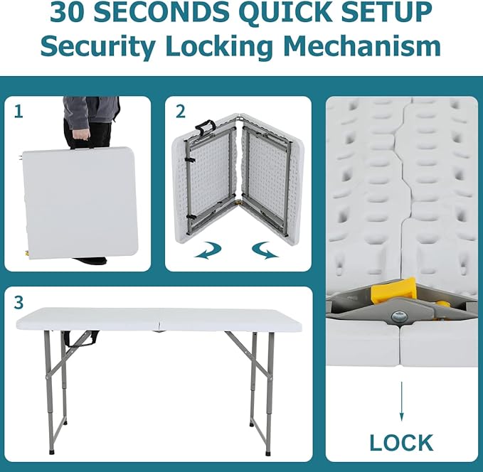 4FT Folding Table, Height Adjustable Table, Heavy Duty Plastic Tables Portable Fold-in-Half Utility Table w/Handle & Lock for Camping BBQ Party Banquet Wedding Market Events, 330LBS