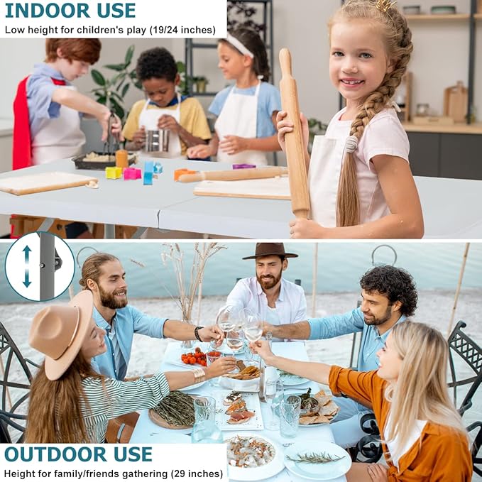 - 【Height Adjustable】The party table has three flexible heights 19,24,29 adjustable for use in different places to meet your different needs. This folding table weighs about 20 pounds and has an unfolded size of 47 "L x 23.6 "W x 29 "H; the folded size is 23.6 "L x 23.6 "W.