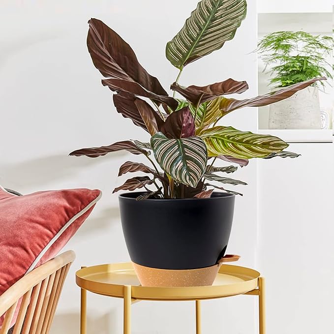 WOUSIWER 10 inch Self Watering Planters, 2 Pack Large Plastic Plant Pots with Deep Reservior and High Drainage Holes for Indoor Outdoor Plants and Flowers, Black with Terracotta