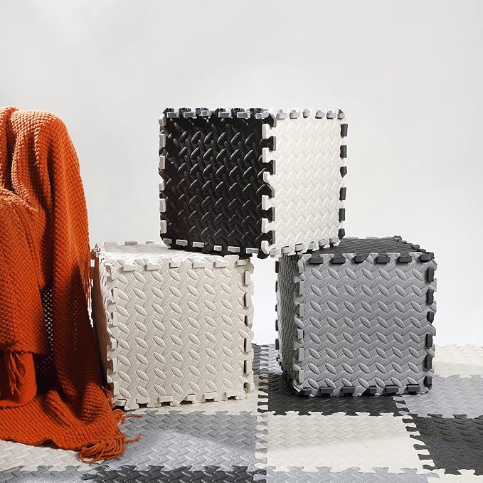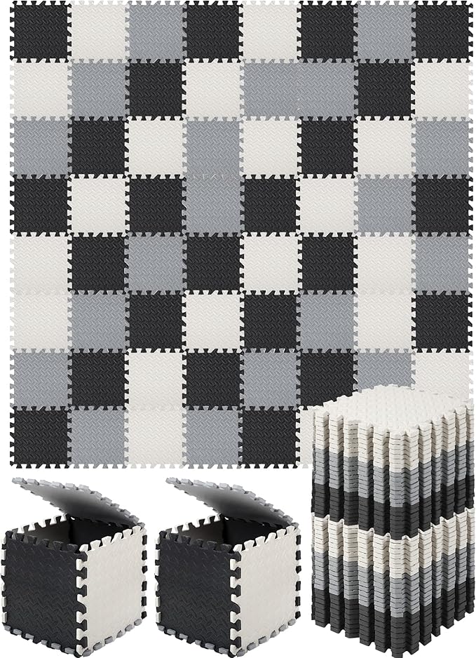 Shihanee Foam Floor Baby Tiles Foam Floor Mats Play Mats Bulk with Borders Interlocking for Kids Baby Playroom Nursery Gym (Black, White and Gray,64ft)