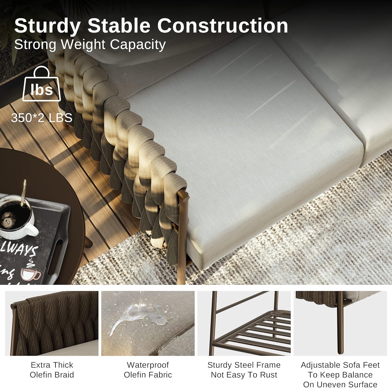 - STRONG BEARING CAPACITY DESIGN: Made of a high-quality steel frame with electrophoresis and plastic spraying treatment. It has good rust and weather resistance. East Oak patio loveseat sofa can provide high load-bearing capacity of 700 lbs
