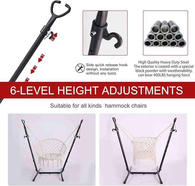 - ✅ [Excellent material technology] It is made of high-quality heavy steel and can easily withstand 400 pounds. The exterior is coated with special black powder, which has weather resistance and rust resistance. It can accompany you for many seasons. The six holes on the suspension chair bracket can adjust the comfortable height and size of the suspension chair at will. It is suitable for suspension chairs and hanging baskets of various brands and sizes. It can easily adapt to your various garden leisure tools.