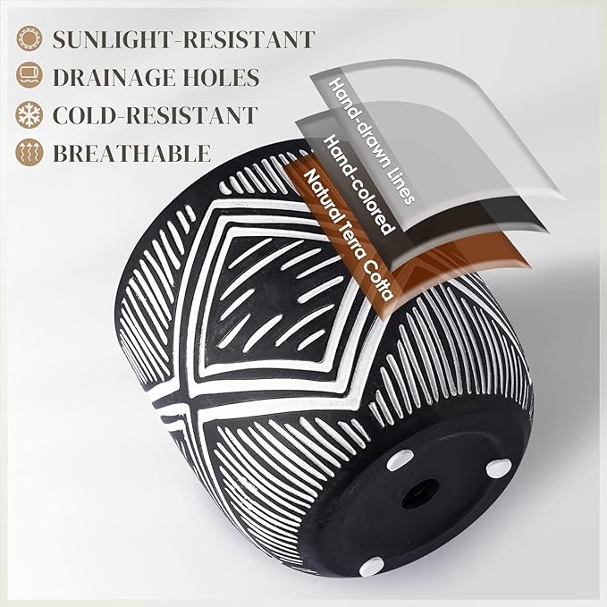 - 【Minimal Modern Appeal】Classic black 6 inch indoor plant pot surface decorated with bohemian white hand-drawn sculpted lines makes for an casual styles. Match your home decoration such as modern,contemporary,minimalist,mid century,bohemian,shabby chic style, etc.