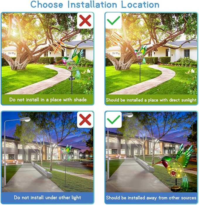 - Easy to Install: No wiring or external power supply is required, just screw all the parts of hummingbird figurines lights, insert into the soil. Suitable for the front yard, flower pot, flower bed, walkway, backyard, garden decoration.