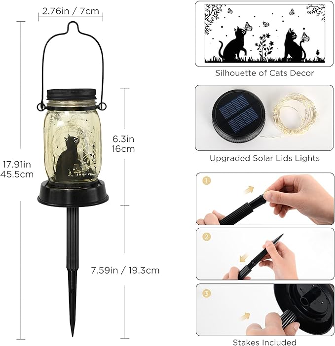 - Cat Solar Garden Lights:the unique shape design of the solar Mason Jar Lights, there are three ways to use it. You can hang it anywhere, hang it on the garden, yard, tree. Or the lawn that is inserted on the ground can also be placed directly on the table and the ground.