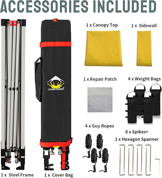 CROWN SHADES 10x10 Pop Up Canopy with 1 Side Wall - Beach Tent with One Push Setup - Outdoor Sun Shade for Events, Parties, Camping - Gazebo with STO-N-Go Cover Bag (Yellow)