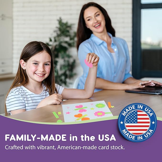 - DURABILITY OF HIGH-QUALITY CARD STOCK: Each set includes 16 sheets of sturdy, US-made high-quality card stock that holds easy punch-out shapes. The card stock comes in four bright NEON colors, adding a vibrant touch to your projects. With a total of 676 pieces, you'll have plenty of shapes to fuel your creativity. Our products are not printed, not construction paper, and not foam shapes—ensuring that you get the highest quality materials for your crafting needs.