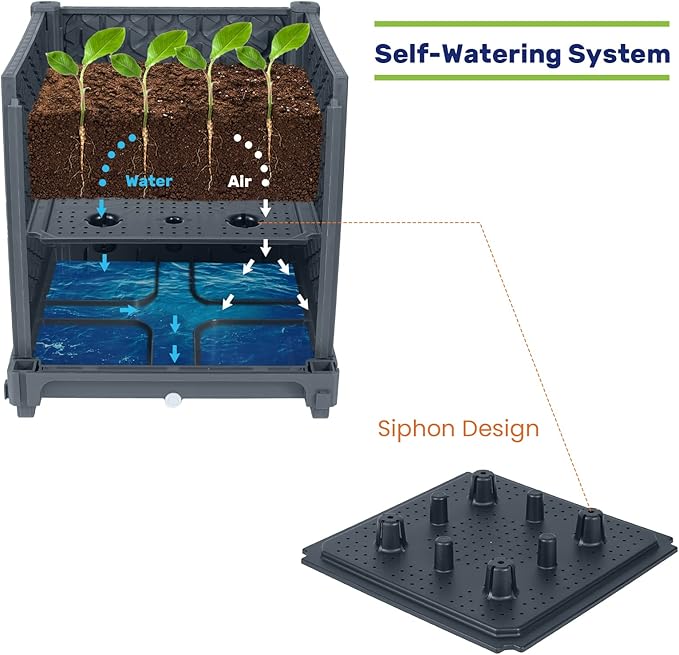 - Reservoir System: Display your favorite flowers or plants with this convenient self-watering tomato planter! This raised garden bed features a self-watering reservoir that automatically absorbs water and irrigates plants for several days. Plus, 4 drainage holes effectively drain excess water to prevent root rot due to accumulating and over-soaking