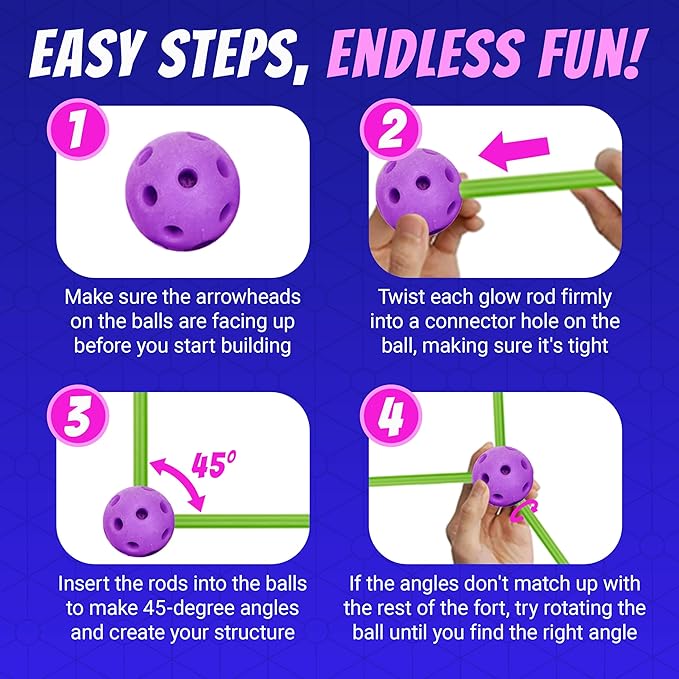 - BLANKET FORT KIT - Standard Fort Building kit includes 86 Purple Connecting spheres, 44 Green Building rods, a Drawstring Storage Backpack, a Hanging Tent Light (3 x AAA batteries not included), 2 Fort Blankets, 8 Blanket Clips, Manual with Fort Ideas. That’s a total of 142 pieces!