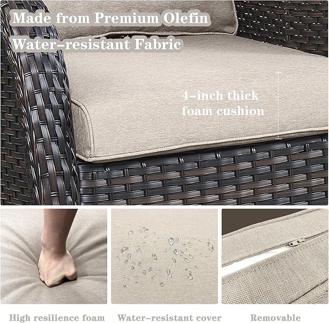 - Comfortable And Easy To Clean: Each glider chair and sofa in this outdoor set comes with a 4-inch thick foam seat cushion and an 8-inch thick cotton back cushion, which is ergonomic and enhances the overall comfort of the chair. The chair cushion cover is made of outdoor professional olefin fabric which is water resistant, and the seat cushion is equipped with zippers that are removable and easy to clean.