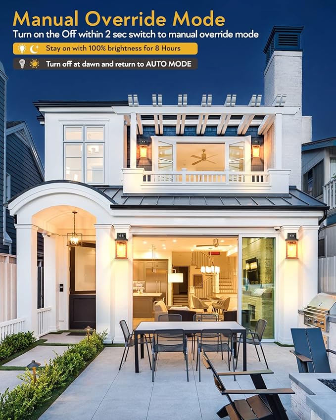 - ☀️【New Sensor】The motion sensor light has been completely upgraded. Our outside lights for house have 3 lighting modes; just press the button to achieve one-touch switching mode. ① Dim mode: 30% brightness when there is no motion, 100% brightness when motion is detected. ② ECO mode: 100% brightness when motion is detected, 0% brightness the rest of the time. ③ Override Mode: continuously lighting for 8 hours at night. The 3 modes automatically turn off the exterior light fixture when dawn comes.