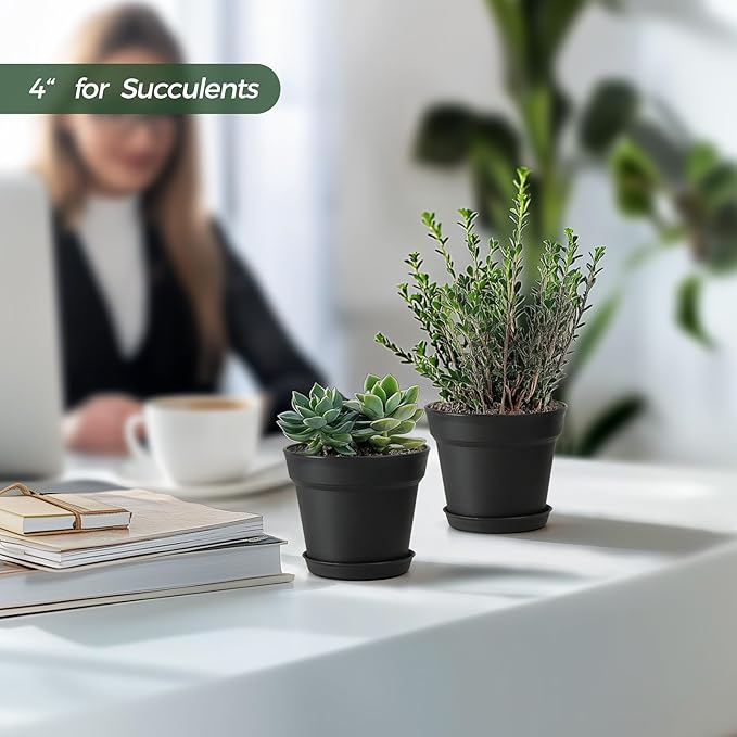 T4U 4 Inch Plant Pots 18-Pack - Small Plastic Planter with Drainage Hole and Saucer, Decorative Nursery Pot Bulk for African Violet, Snake Plant, Succulent and All House Plants Indoor (Black)