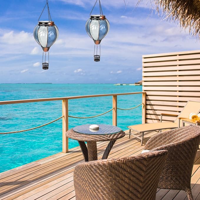 - 【Unique Hot Air Balloon Design】--This hanging solar light is composed of 8 pieces of blue and white glass with lifelike flame lights. As night falls, their glow adds warmth and comfort to your garden, patio, yard, path, and more. great Christmas decorative lights.