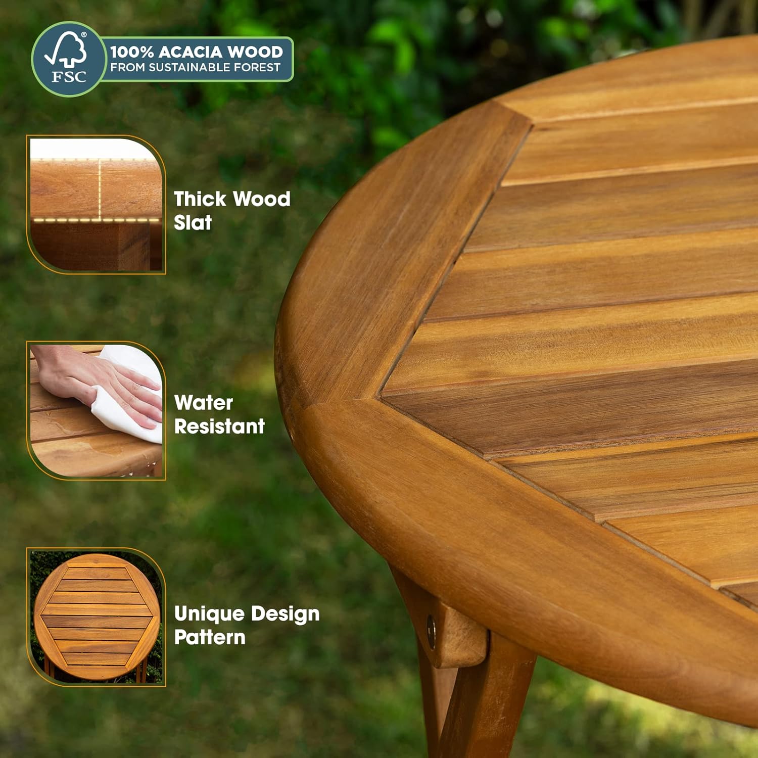 - 『SIMPLE TO MAINTAIN WITH HIGH-QUALITY COATING』: This folding bistro set features a high-quality protective coating that shields the surface from UV rays and harsh weather, ensuring our 3-piece acacia wood patio bistro set stays in great condition with minimal effort.