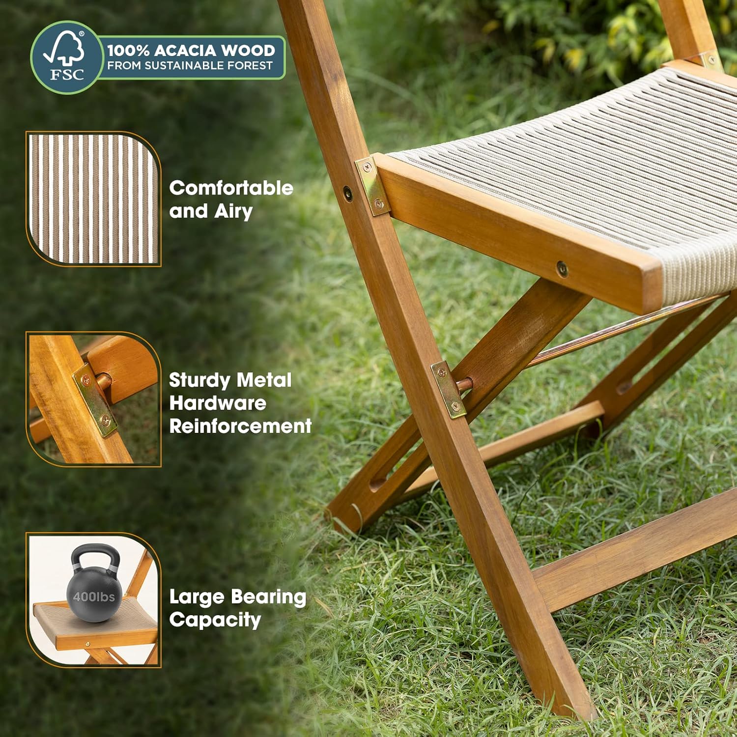 - 『HEAVY DUTY OUTDOOR BISTRO SET』: Crafted from quality FSC-certified Acacia Wood and strong polypropylene rope, our wooden bistro set is built to last; Reinforced by metal hardware, our chair ensures a sturdy structure & a high capacity of up to 400 pounds