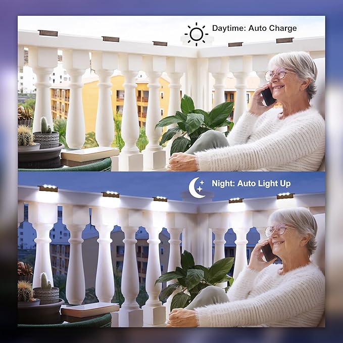 - 【Solar Powered and Automatic Work Mode】The balcony lights is powered by Solar, which means free electricity and no wires. Free your hands on switching the solar deck lights for outside on/off all the time as this special solar decoration lights would automatically turn on at dusk and turn off at dawn