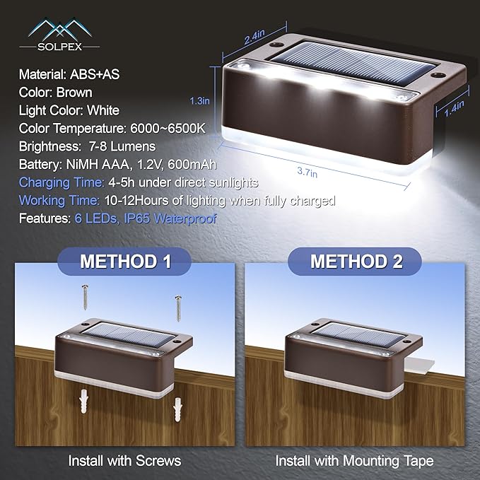 - 【IP65 Waterproof & Long working time】The deck lights solar powered are designed with IP65 waterproof. With the upgraded solar panel and rechargeable battery, the solar step lights for outside can illuminate up to 15 hours after fully charged for 4-6 hours with direct sunlight