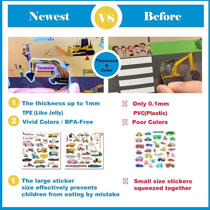 - 🏗【Large Size & Numerous Stickers】In order to make the size of each small sticker large enough, Cafalibe’s Team used two large-size sticker sheets and added more stickers up to 45pcs, so that children can explore their world more safely and happily.