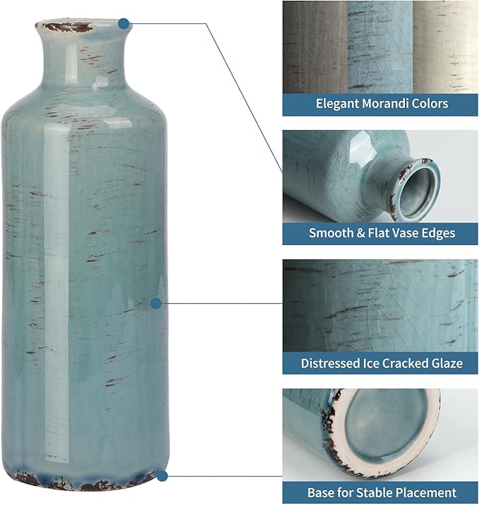 - Elegant Look: The distressing techniques are adopted to make these three vases so stunning. There is crackled rustic design on the surface of the vases They fit various types of styles, such as modern farmhouse, rustic, classic charm, country, and elegant yet simplistic. The sizes and shapes of these three vases are specially designed, they are in perfect harmony while using together.