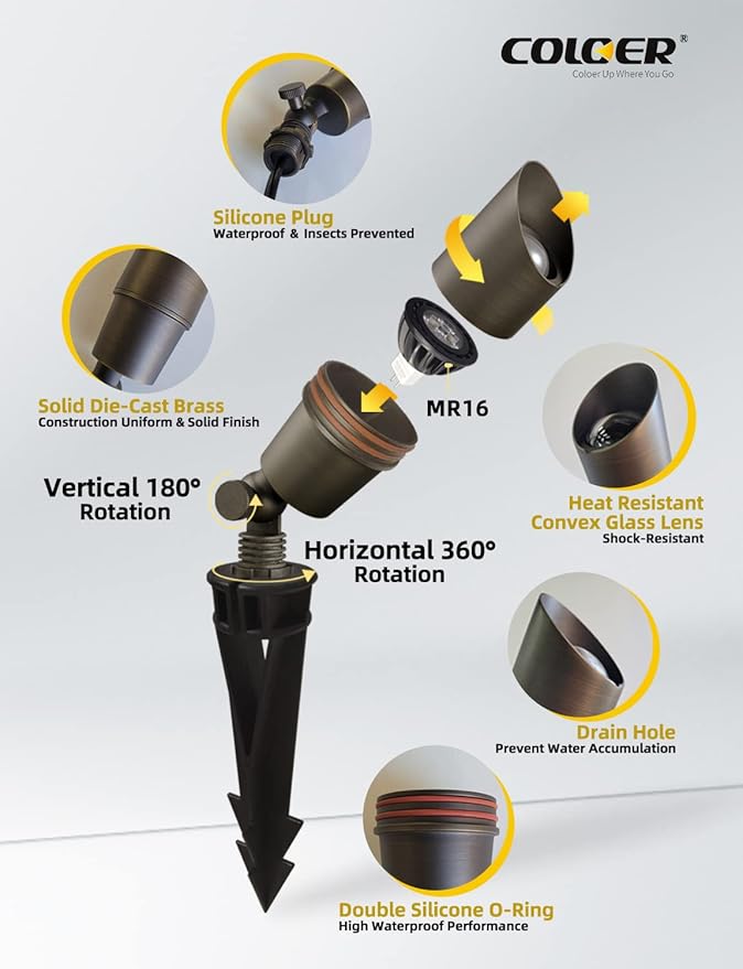 - FLEXIBLE INSTALLATION: Our low voltage landscape light features a cleated heavy-duty stake design, making it easy to mount on the ground. Additionally, there is a screw for adjustment in the middle of the spotlight, allowing you to rotate the outdoor spotlights for yard up to 180° in the vertical direction. These Brass landscaping lights offer a 360° horizontal rotation by adjusting the ground stake. Allows you to illuminate any angle you want without even moving the fixture.