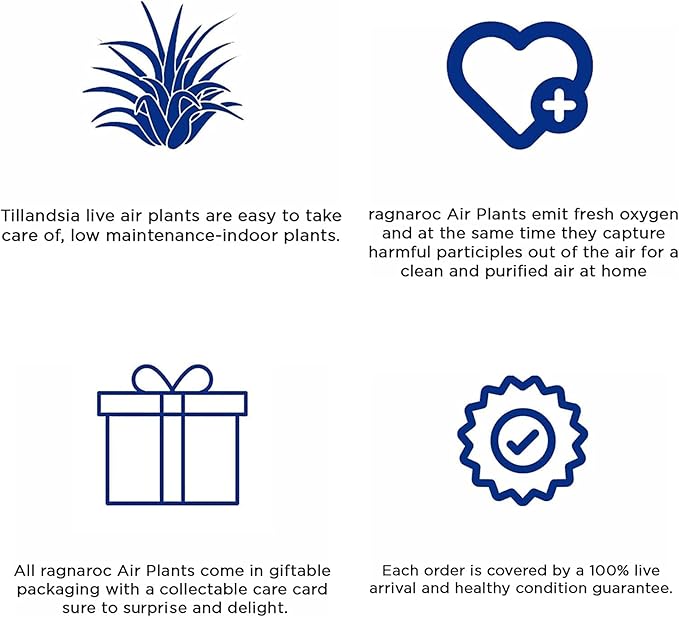 - HEALTHY PLANT ARRIVAL ASSURANCE: ragnaroc is committed to delivering vibrant and thriving air plants to your doorstep. Our live air plants are packed directly from Florida, and every order comes with a promise of their safe and healthy arrival. If, for any reason, you find yourself less than satisfied with our plants, please inform us, and we will promptly arrange a full refund or send you replacement plants.