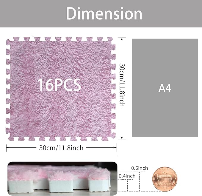 16pcs 0.6" Thickened Interlocking Tile Mats,Fluffy Shaggy Soft EVA Foam Area Rug for Living Room & Bedroom,Non-Slip Protective Floor Carpet Play Mat Kids Baby Dorm Home Decor (11.8ft, Pink)