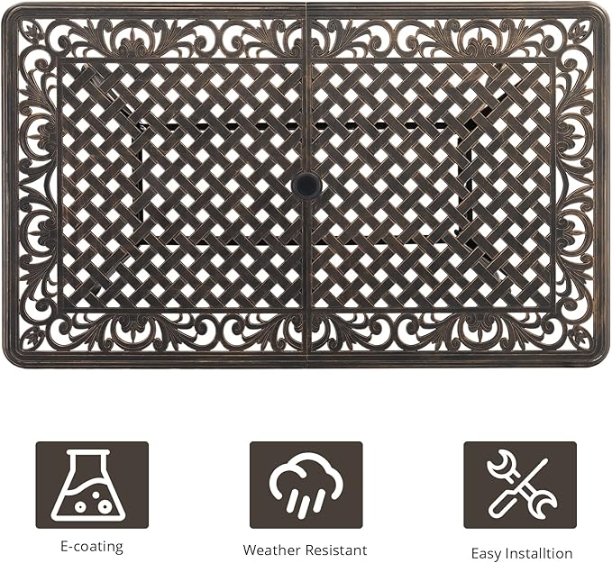 - Spacious and Durable: This cast aluminum dining table measures 35.4" x 59", offering ample tabletop space to comfortably seat 4-6 people. It is an ideal choice for outdoor dining, family gatherings, and summer barbecues. The sturdy cast aluminum construction ensures long-lasting durability, capable of withstanding various weather conditions