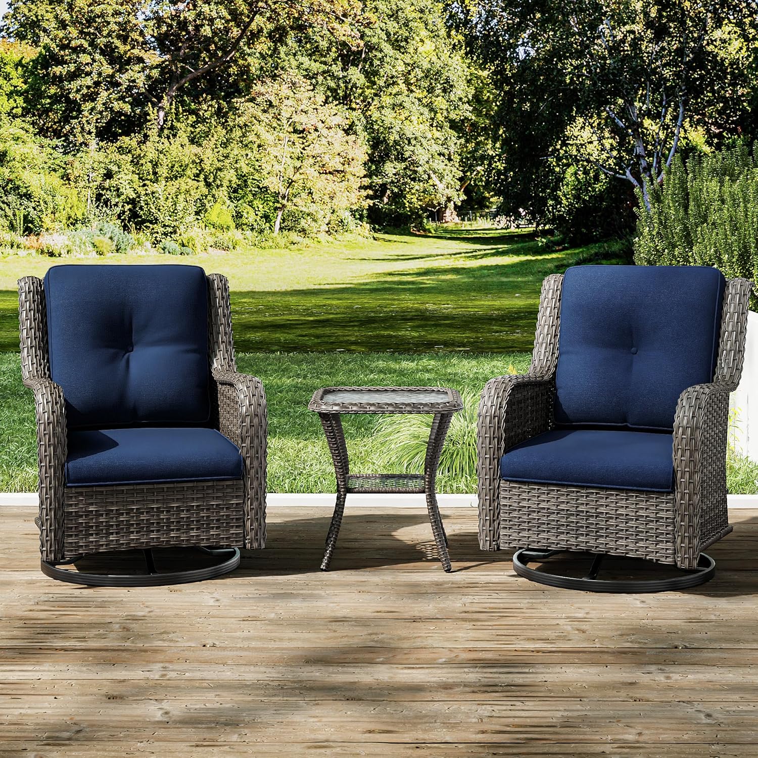 Joyside Outdoor Swivel Rocker Patio Chairs Set of 2 and Matching Side Table - 3 Piece Wicker Patio Bistro Set with Premium & Soft Fabric Cushions(Mixed Grey/Blue)